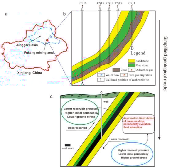 Characteristics of steeply-dipping coalbed methane (CBM) reservoirs, (a) location of the study area in China, (b) characteristics of the coal seams in the Badaowan Formation of the west Fukang Block [16], (c) a simplified geological model of a steeply-dipping CBM reservoir.