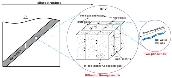 The coal seam may be typified as dual-porosity systems consisting of micro-pores in a matrix and fractures (cleats). The matrix contains adsorbed gas with the cleat system providing an effective flow path for both water and gas. CBM production begins with the dewatering of the coal seam to recover the desorbing gas. Fluid flows within the fractures satisfy Darcy’s Law, and the gas diffusion between the matrix and fractures follows Fick’s Law [35]. The general process of methane and water migration in the coal seam is schematically shown in Figure 2. CBM extraction also involves the complex interactions between hydrological and mechanical fields, which exert strong influences on the fluid transport processes within the coal seam. These “coupled processes” include influence effects on the gas desorption and flow processes and coal deformations, as well as porosity and permeability changes [36]. A set of field governing equations are defined that govern coal deformation, and the transport of fluids are defined that assume: (a) The coal seam is a single-permeability poroelastic continuum with dual-porosity interaction between matrix pores and fractures; (b) Water is present and migrates only in the fractures, and the methane exists and migrates in both the matrix micro-pores and fractures, with the fractures saturated by both methane and water. The adsorbed gas in the matrix, and the water in the fractures, are considered to be the principal sources of the gas and water seepage fields, respectively; (c) The methane is adsorbed on the pore surfaces of the matrix and satisfies Langmuir isothermal adsorption; (d) The fractures are saturated by both methane and water; (e) The methane is an ideal gas; (f) Buoyant transport of both water and gas are considered; (g) The coal seam is isotropic and homogeneous. The derivations of the coupled hydro-mechanical model are presented in Appendix A.