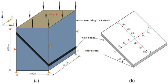 This study simplifies the engineering practices of the CBM drainage in the western section of the Fukang Mining Area, located in the southern margin of the Junggar Basin, China, and a single vertical well drainage system and its mining processes are simulated. The extraction of the CBM buried at a depth of 800 m is simulated as a single vertical well. A representative physical model of a square reservoir block measuring 400 m × 600 m × 500 m is constructed. Then, by combining the actual stratum conditions in the field with the simulation data, the dip angle of the coal seam in the model is set as 45°, and the thickness of the coal is set to 20 m (Figure 3a). The buried depth of the upper part of the model is established as 1000 m, and a constant equivalent load is applied to the upper boundary of the model according to the average volume weight of the overlying strata of the coal seam. The boundaries around and at the bottom of the model are fixed. The drainage well is located in the middle of the coal seam, with a diameter of 0.2 m. All of the external boundaries are adiabatic and non-permeable for both the CBM and water. Therefore, under the initial conditions, the coal seam is considered to be in a state of free stress, and the initial reservoir pressure is determined by the reservoir pressure gradient. To facilitate this study’s quantitative analysis, a plane perpendicular to the normal direction of the coal seam is taken as the observation plane in the middle of the coal seam. Two lines (AB and CD) are set in the middle of the observation plane in Figure 3b. To quantitatively analyze the gas-water variation characteristics in the up-dip and down-dip directions of the CBM reservoir (line AB), three couples of observation points on the symmetry of the well are identified on the line AB, and designated as up1, dp1; up2, dp2; and up3, dp3, respectively, which are located at 30 m, 70 m, and 230 m from the wellbore, respectively. Similarly, along the strike (line CD), three couples of symmetrical observation points are set at symmetrical positions of the production well, which are designated as h1, h11; h2, h22; and h3, h33, respectively. The distances between observation points along the strike are the same as those between points along the dip.