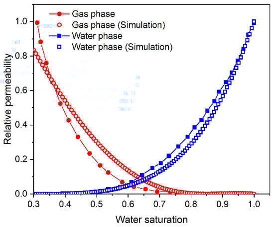 Based on the field data and related references, the main input parameters used in this model are listed in Table 1. For this simulation work, the relative permeability curve is one of the important elements. The method of history matching is of practical significance when laboratory data is unavailable [37]. Besides, it might also be the significant practical method to obtain realistic relative permeability values because a relative permeability relationship is measured in a core, these measurements are often not representative of the behavior exhibited by gas and water production from a well, when upscaling laboratory results to reservoir conditions [38]. Therefore, the parameters of the relative permeability curve, which is used in this simulation work, are first obtained by the history matching results, according to the adjacent CS18 well site (data from [15]), and then these parameters are input into the numerical model to predict the production of other wells in the same area (well site 15). Figure 4 shows the comparative result of the curve of Corey relative permeability model (Equations (A26) and (A27)) used in this simulation and the actual curve of adjacent well site history matching. Although the Corey model curves are not perfectly consistent with the actual relative permeability curves, due to the simple model structure, it might still reflect the in-situ reservoir conditions.