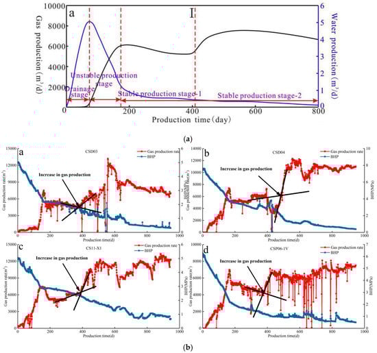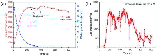 Production profile characteristics, (a) numeric simulation results of the water and gas production rates, (b) gas production profile for the well group 15 in Fukang Mining Area.