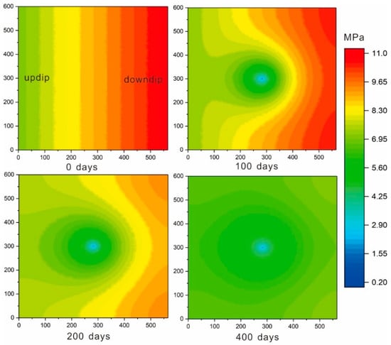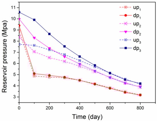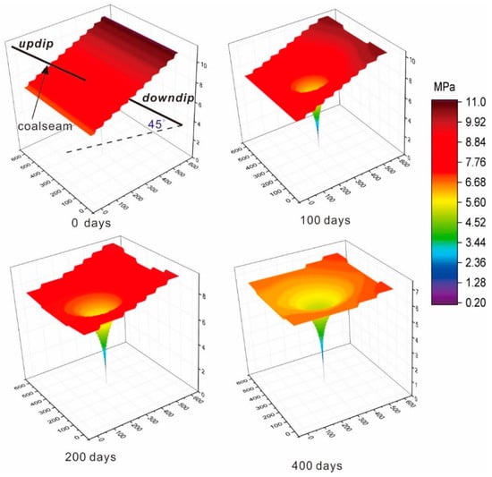 It is observed in this study that during the early stage of drainage and production (<100 days), the reservoir pressure levels drop sharply near the production well (along the coal seam dip with a distance of 30 m; points up1 and dp1). The initial reservoir pressure at point up1 is 8.9 MPa, and drops to 4.87 MPa after drainage for 100 days, i.e., a drop of 45.2% (Figure 10; Table 2). The initial reservoir pressure at point dp1 is 9.4 MPa, and decreased to 5.09 MPa after 100 days, with a corresponding depressurization of 45.8%. While for farther points up2 and dp2, 70 m away from the well along the dip, the depressurization is smaller. The initial pressures for points up2 and dp2 are 8.36 and 9.98 MPa, respectively, which separately changed to 7.05 and 8.30 MPa (reduction of 15.6% and 16.8%) after 100 days. For the farthest observation points up3 and dp3 (230 m away from the well along the dip), the initial pressure is 7.71 and 10.6 MPa, which decreases to 7.62 and 9.91 MPa, respectively, after 100 days of drainage (with depressurization of 1.16% and 6.5%). Obviously, it is observed that the depressurization along the down-dip is larger than that along the up-dip during the initial drainage stage. In addition, it is found that the farther away from the wellbore the area is, the greater the differences in depressurization between the up-dip and down-dip direction with the same distance away from the wellbore would be.