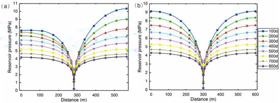 Unlike horizontal reservoirs, the initial reservoir pressure differences (Figure 7 and Figure 8), which exist in the steeply-dipping coal reservoirs before drainage (for example, the initial reservoir pressure rates in the up-dip and down-dip directions of the reservoirs) tend to be different. Since the main driving force of reservoir drainage is the pressure gradient between the reservoir fluids and the bottom holes of production wells, the characteristics of the reservoir depressurization in the up-dip and down-dip directions will vary, as detailed in Figure 7, Figure 8, Figure 9 and Figure 10. In addition, due to the different densities of the gas and water, the gas-water gravity differentiations are also one of the factors affecting the asymmetric distributions of the pressure drops.