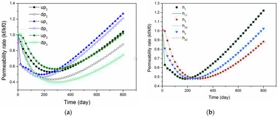 Similar to the finding of previous studies, in the process of drainage and production, the effective stress and matrix shrinkage have alternately become the dominant factor for permeability evolution. The permeability first decreases, and then rebounds (Figure 11). The different distribution of the reservoir permeability along the dip of the reservoir is one distinct difference between the flat and incline reservoirs. The permeability evolution of steeply-dipping reservoirs demonstrates space-time effects. Along the dip of the reservoir, the effective stress dramatically increases as the reservoir pressure sharply decreases at the initial stage of CBM recovery. The permeability of a couple of points decreases almost synchronously. A reduction of up to 60% from the initial permeability is observed after drainage for 20 days (Figure 11a). Next, due to the positive effects of the matrix shrinkage, the decrease rates of permeability for points up1 and dp1 decelerate; however, the effective stress still dominates the evolution of reservoir permeability. After ~180 days, the permeability at points up1 and dp1 rebounds, and the permeability ratio at these two points decreases to 0.49 and 0.46, respectively. Subsequently, the matrix shrinkage begins to dominate the permeability evolution, and the permeability increases gradually. The permeability at these two points is, respectively, 1.26 and 1.2 times that of the initial values at 800 days.