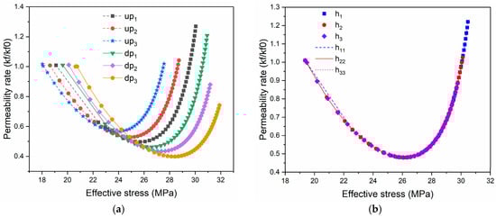 In brief, from the perspective of time, the asymmetric permeability evolution along the dip of the steeply-dipping reservoir is controlled by the negative effects of effective stress and the positive effects of matrix shrinkage, which alternately becomes the dominant factor during the whole production. From a spatial aspect, due to the asymmetry of the in-situ stress distribution and reservoir depressurization along the dip, the negative effects of the effective stress on permeability within the upper section are weaker than those within the lower section (Figure 12a). The negative effects of the effective stress at locations far from the drainage well play a major role in controlling the evolution of permeability.