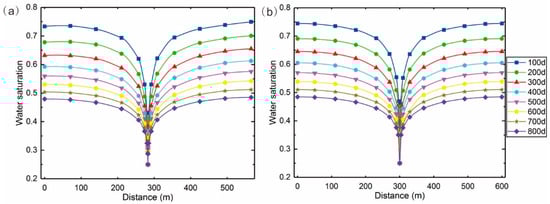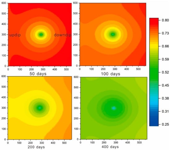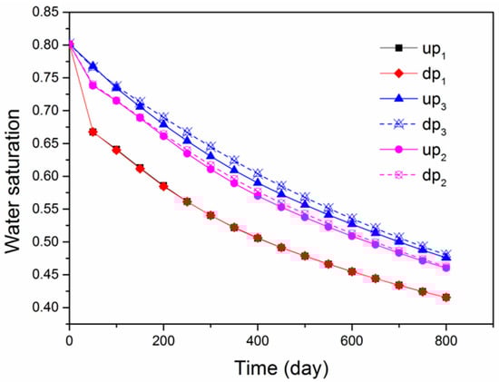 Unlike the single-phase seepage, in the study of two-phase seepage, the distribution of fluid saturation is another key issue that need to be investigated. Fluid saturation affects the migration of gas and water in coal seams by controlling the relative permeability. The distribution of water saturation in the steeply-dipping CBM reservoir is different from that in the horizontal reservoir (Figure 13, Figure 14 and Figure 15). In the vicinity of the well, taking points up1 and dp1, for example, the water saturation changes synchronously, and the magnitudes are approximately the same throughout the whole drainage process. While for the farther areas along the dip, such as the symmetrical points up2 and dp2, or up3 and dp3, during the initial drainage stage (<100 days), the magnitudes of water saturation in the lower section (dp2/dp3) and upper section (up2/up3) are also almost the same. During the mid-term stage of drainage (100–700 days), water saturation levels in the lower section are slightly larger than those in the upper sections, and get close again at the final stage (>700 days) (Figure 15).
