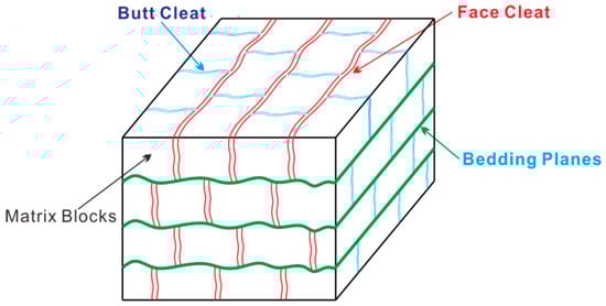 The evolution of production and transport characteristics of steeply-dipping UTCBM reservoirs have been revealed, which are mainly attributed to the geological characteristics related to the large dip angles. However, the results fail to accurately reflect the influences of such characteristics as the “ultra-thick and low-rank coal seams” during the CBM extraction. The limitation of the existing isotropic permeability model, which is commonly adopted in numerical simulation, results in this failure. Actually, coal is one kind of typically anisotropic material, including permeability and mechanical properties, particularly in the cases of low-rank coal seams [41,42]. Figure 16 shows that the aperture sizes of the cleats (face and butt cleats) and structure of bedding planes, which potentially cause the permeability anisotropy. According to the field and laboratory test, it has been confirmed that the horizontal permeability is often larger than that in the direction of the vertical bedding planes [43,44]. Recent experimental research has reported the properties of anisotropic permeability of low-rank coal samples in Fukang Mining area, which indicates that the Hellum permeability decreases from the face cleat direction to the butt cleat direction, and then perpendicular to the bedding direction, with a maximum ratio of the three directions reaching approximately 10.98:4.69:1 [42]. For the thinner CBM formations, the vertical permeability is almost negligible, due to the dominant horizontal flow [43], while the effect of vertical permeability might be more pronounced in the cases of ultra-thick coal seams [20]. Therefore, it is necessary to further investigate the anisotropic permeability models of coal in accordance with the actual conditions of low-rank and ultra-thick coal seams.