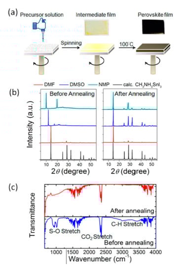 - Liu, X.; Yan, K.; Tan, D.; Liang, X.; Zhang, H.; Huang, W. Solvent engineering improves efficiency of lead-free tin-based hybrid perovskite solar cells beyond 9%. ACS Energy Lett. 2018, 3, 2701–2707. [Google Scholar] [CrossRef]