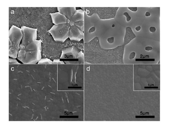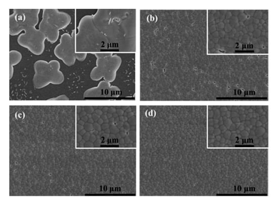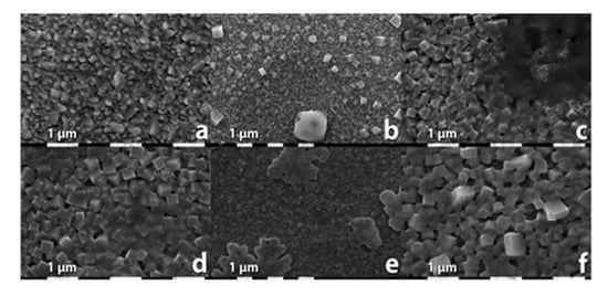 Kanatzidis and coworkers also suggested a low temperature vapor assisted solution process (LT-VASP) for minimizing p-type doping, reducing short circuiting and enhancing film quality for Sn based perovskites [,]. An overall PCE of 1.86% was reported for the best performing device. This method yielded better surface morphologies of perovskite films with great reproducibility and enhanced air stability. However, the first considerably stable MASnI3 based perovskite films were reported by Horn et al. [], where they used a two-step fabricating technique. These films showed remarkable stability as compared to all the earlier reported MASnI3 films both in air and in nitrogen glove box. These stable perovskite films were obtained by depositing SnI2 on FTO substrates using thermal evaporation of SnI2 at a slow rate (2nm min−1) in a vacuum. Followed by spin coating a solution of MAI in 2-propanol. Morphological studies as shown in Figure 2 revealed a higher coverage of substrate with perovskite crystals as compared to films synthesized using solution based processes.