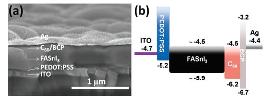 (a) A cross-sectional view of the fabricated device having 10 mol% SnF2 additives as seen under SEM; (b) Energy level diagram. Adapted with permission from []. Copyright © 2016, WILEY-VCH Verlag GmbH & Co. KGaA, Weinheim.
