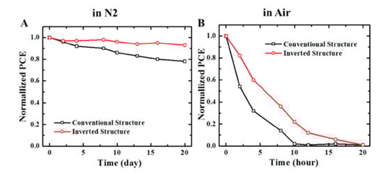 In the quest of achieving high PCE and considerable stability for lead free FA based tin PSCs Chueh et al. [] used sequential deposition route. To form defect free homogeneous FASnI3 films the reaction rate between FAI and SnI2 was controlled. In the first step of deposition tri-methylamine (TMA) was incorporated in Sn solution to form SnY2-TMA (Y = I−,F−) complexes [] followed by intercalating with FAI to produce FASnI3. This method allowed Jen and group to realize PCE of 4.34% and 7.09% for conventional n-i-p and inverted p-i-n PSCs, respectively []. When tested for stability the inverted device comparatively showed better stability than conventional device. In ambient air with 50% relative humidity the un-encapsulated devices degraded within the first 24 h. However, when stored in inert environment both devices retained more than 80% of their performance for 20 days. Figure 6 relates the PCE of devices with respect to storage time in different environments.