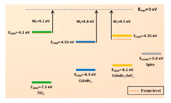 Cahen and group reported an optimization strategy for CsSnBr3 based devices by selecting different electron transport materials (ETM) and hole transport materials (HTM) layers for conventional n-i-p architecture based PSCs []. Devices were fabricated using TiO2 and Al2O3 as ETM while PTAA, CBP and Spiro-MeOTAD were chosen as HTMs. By using TiO2 as ETM, spiro-MeOTAD as HTM and 20 mol% SnF2 doping, optimized PCE of 2.1% was achieved with a JSC of 9.1 mA·cm−2, a VOC of 0.42 V and a FF of 57%. All other combinations of HTM and ETM produced unsatisfactory results. The band alignment diagram of optimized device comparing effect of SnF2 addition in CsSnBr3 is given in Figure 7. When work function and ionization potential (valence band maximum, EVBM) of pristine CsSnBr3 was compared to CsSnBr3 doped with 20 mol% of SnF2, the role of SnF2 doping was revealed as it decreased work function (WF) and the ionization potential of CsSnBr3 as shown in Figure 7. This decrease in EVBM of CsSnBr3 resulted in reducing the voltage loss by bringing it close to HOMO of spiro-MeOTAD.