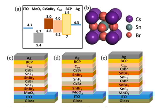 Moghe and group fabricated CsSnBr3 based PCSs using thermal deposition [] to achieve 50 min stable devices under continuous 1 sun irradiation and ambient conditions without any encapsulation. Planar heterojunction architecture was selected for device fabrication with CsSnBr3:SnF2 sandwiched between MoO3 and C60. Figure 8a gives the band alignment diagram of fabricate devices. SnF2 dopant was incorporated in the devices with different concentrations of 0%, 2.5%, 5% and 7.5%. The position of SnF2 vapor deposited layer was also varied as shown in Figure 8. The best efficiency of 0.50% was obtained for devices having 2.5 mol% of SnF2 doping and SnF2 layer sandwiched between CsBr and SnBr2. While these devices are expected to have considerable stability when properly encapsulated, the low PCE limit its application on commercial scale. Kanatzidi’s group further optimized the CsSnBr3 perovskite layer by using hydrazine vapor atmosphere to grow CsSnBr3 films []. This technique along its effects on perovskite layer has already been discussed in previous sections. Using reducing vapor atmosphere during CsSnBr3 film growth they were able to suppress tin vacancies and reduce Sn2+ oxidation. A maximum PCE of 3.04% was recorded for CsSnBr3 based devices.
