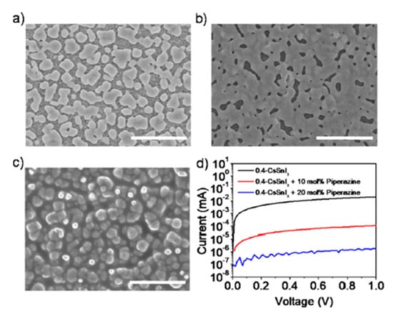 In a similar attempt of enhancing the performance of CsSnX3 based devices, Kanatzidi’s group explored the possible effects of adding Piperazine to precursor solution of CsSnI3 perovskite films []. Adding piperazine significantly suppressed the self-doping of the perovskite films and increased surface coverage while simultaneously reducing the crystallization of excess SnI2. Perovskite films were spin coated keeping ratio of CsI/SnI2 as 0.4. The molar ratio of piperazine to tin was changed from 0 to 25% by adding 2 M of piperazine solution to CsSnI3 solution. Films were annealed at 90 °C for 25 min. Addition of piperazine significantly improved the film coverage by suppressing excess SnI2 crystallization. Figure 9 reveals the morphologies of perovskite films prepared from 0, 10 and 20 mol% of piperazine addition as seen under scanning electron microscope (SEM).
