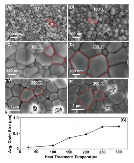 Sun and coworkers reported 3.31% efficient perovskite device based on a coarse grain B-γ-CsSnI3 perovskite film []. A single step spin coating technique was employed to produce the perovskite films from the precursor solution, followed by 2 min annealing at 100 °C, 150 °C, 200 °C, 250 °C and 300 °C. The grain size showed an increasing trend with increase in annealing temperature as can be observed in Figure 10. Grain size averaged 50 nm for films without any temperature treatment. For films annealed at 100 °C average grain size of 100 nm was reported, which further increased to 350 nm for 150 °C annealing temperature. Figure 10G represents the annealing temperature vs. average grain size.