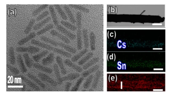 (a) CsSnI3 Perovskite QRs as seen under TEM. (b–e) Selected zoom-in TEM images of several QRs: (b) A single CsSnI3 perovskite QR as seen under TEM with corresponding energy dispersive spectroscopy (EDS) elemental mapping images, confirming that (c) Cs, (d) Sn, and (e) I are sequentially and uniformly spread over the entire surface of the CsSnI3 QRs. The scale bars are 5 nm. Adapted with permission from []. Copyright © 2016, American Chemical Society.