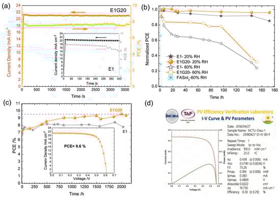 The stability of encapsulated devices based on MASnI3 reached 500 h when Yamada et al., used SnF2 incorporated MASnI3 perovskite films []. Hao et al., previously used SnF2 doping in MASnI3 films to increase carrier diffusion length up to 500 nm []. Yamada and group reported a bandgap of 1.25 eV for SnF2 doped MASnI3 films, while films without SnF2 doping showed an absorption edge that was significantly blue shifted. This blue shifted absorption edge in pure MASnI3 films was assigned to unintentional p-type doping. SnF2 addition increased the photocarrier lifetime by one order of magnitude. These encapsulated devices showed a PCE of 1.94% with an astonishing stability of 500 h under 1 Sun illumination [].