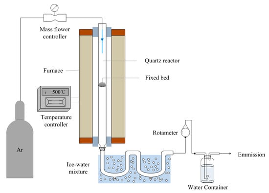 As is shown in Figure 1, the quartz tube reactor (870 mm × 40 mm) was fixed in an electrically heated furnace. Then, 3 g well-mixed FB and glucose at various ratios were preloaded onto the quartz frit in the middle of the tuber reactor. When conducting pyrolysis experiments, the sample was heated at 20 °C/min till the prescribed temperature of 500 °C was reached, with a holding time of 60 min; the whole process was controlled under Ar atmosphere. The volatiles flew through a U-type tube that was soaked in ice-water to be condensed. Before being released into the atmosphere, the flue gas was washed in a flask containing water. Char yields was obtained by measuring the weight difference in the reactor before and after pyrolysis experiments. The nitrogen contents in solid samples were detected by a Vario ELIII Elemental Analyzer (Elementar, Germany).