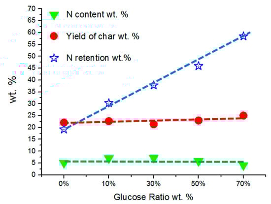 The positive relationship between the N retention and the percentage of glucose in the feedstock confirms that the concentration of glucose-derived volatiles was a critical factor in retaining N in chars. On the other hand, the increase in the use of glucose must have altered the secondary reactions to a certain extent [3,51]. For example, the volatiles from the primary decomposition of glucose may interact with wood-derived chars or volatiles before reacting with UF-derived N-containing species when the glucose is in a small proportion. When the glucose was dominant in the mixture, secondary reactions may likely occur among glucose-derived products. The linear increase in N retention with the increase in use of glucose implies that the various active compounds in the gas phase could be effective in the fixation of N in chars. The exact reaction mechanism related to the specific active species here remains unknown and further study is warranted.