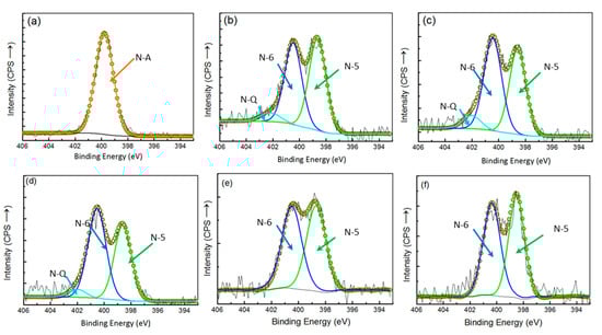 N 1s XPS spectra: (a) FB; (b) char from FB; (c) char from FB with 10% glucose; (d) char from FB with 30% glucose; (e) char from FB with 50% glucose; (f) char from FB with 70% glucose (N-A: Amide-N, N-5: Pyrrole-N, N-6: Pyridine -N, N-Q: Quaternary-N).