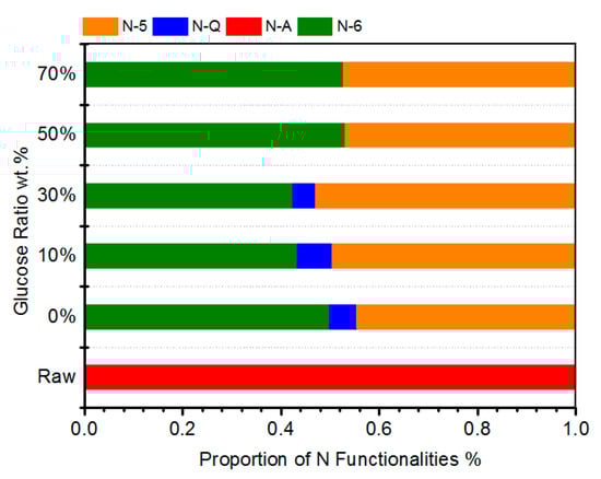 Figure 4 shows the relative contents of N-functional groups distributed in the chars as a function of percentage of glucose in the blended feedstock. The most striking difference was that the N-Q could be obviously detected when the portion of glucose was lower than 50%, and it completely disappeared with the increase in glucose abundance up to 70%. The nitrogen atom of N-5 and N-6 appears at the edge of graphitic layer, while the N-Q is evolved when a carbon atom in the center of a graphitic layer is displaced by N. Usually, the N-5 and N-6 were firstly produced from the pyrolysis of amide, amino and protein N inside biomass. With temperature increasing to around 500 °C, a more stable structure of N-Q could be formed via cyclic condensation reactions from N-5 and N-6 [54,55].