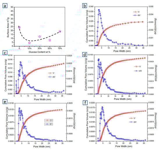 (a) Surface area in chars from different glucose: FB ratios; (b) pore size distribution (PSD) of char with no glucose; (c) PSD of char with 10% glucose; (d) PSD of char with 30% glucose; (e) PSD of char with 50% glucose; (f) PSD of char with 70% glucose.
