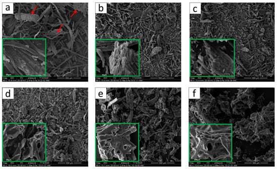 The surface morphology was obtained by SEM analysis and was in direct agreement with the measurements of the porosity above. The FB power from the mechanical processing maintained its irregular and fibrous shapes [2,56], as shows in Figure 6a, where some of the woody fibers tended to agglomerate and form bundles in their shape. With a low proportion of glucose added into FB, the biochar morphology did not obviously change (see Figure 6b,c). With further increase in glucose from 30% to 70% in the feedstock, the agglomeration of resultant chars became more severe, among which nearly no single fibrous char particle could be observed in Figure 6f. At the same time, relatively large pores emerged with the increase in glucose content in the mixture, which is in good agreement with the pore size analysis by the BET method.