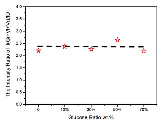 It has been widely recognized that chars originated from biomass at low to medium temperatures contain very limited crystalline carbon structures. Therefore, a Raman instead of X-ray diffractometer (XRD) has been employed to characterize the amorphous carbon skeleton structure in recent years. Generally, two broad peaks of G band at 1580–1600 cm−1 and D band at 1350–1370cm−1 will be obtained for almost all the biochars [58]. While the G band represents the graphitization degree of ordered carbon materials, it mainly reflects the quadrant ring breathing here from the amorphous biomass chars. As introduced in the experimental section, the combined peak areas of Gr, Vl and Vr could denote the abundance of the small aromatic ring system, whereas the signal of the D band was mainly contributed by the large aromatic ring system (no less than six fused rings). The intensity ratio between I(Gr+Vl+Vr) and ID could thus indicate the relative richness of the small aromatic ring system in the char matrix, giving a measure of the amorphous extent of chars [48,50]. As is shown in Figure 7, the values of I(Gr+Vl+Vr)/ID did not see any apparent alteration with the increase in use of glucose in the feedstocks, suggesting that the carbon in the chars share similar structural characteristics regardless of the origins of solid carbons from the FB, the glucose or the soot/coke from the volatile–volatile and/or volatile–char interactions. The lowest impact of glucose addition on the char structure could be very favorable in terms of the potential applications of the N-containing functional carbon materials. In other words, when we examine the effects of glucose on the N retention and transformation during co-pyrolysis with FB, its side effects on the body carbon structure will be of little concern. This will further increase the practical feasibility of using monosaccharides as the promoters to convert waste FB into valuable carbon materials.