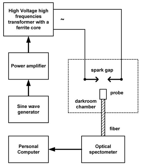 The circuit from Figure 1 consisted of a functional generator (Tektronix AFG1022), whose signal output was connected to the input of a power amplifier using an integrated amplifier on the Texas Instruments OPA541 circuit. The output of the power amplifier supplied the primary winding of the high-voltage transformer adapted to work with high frequency by using a ferrite core. The transformer’s gear ratio was 1:500. The transformer’s secondary winding fed directly to the spark plug terminals located inside the shielded chamber, which also accommodates the spectrometer probe to record the electromagnetic radiation emitted by the electric arc. The optical input surface of the spectrometer was positioned parallel to the generated electric arc at a distance of 1 cm. The optical radiation emitted by the electric arc was recorded with an optical spectrophotometer type HR4000 from Ocean Optics, which allowed registration in the range from 200 to 1100 nm. The transmission of the optical signal from the emission source to the spectrophotometer took place using a polymer optical fiber (POF) with the same spectral range as the spectrophotometer. The optical system was calibrated by the instrument manufacturer and included compensation for the spectral transmission characteristics of the POF optical fiber. The spectrometer data output was connected to a PC.