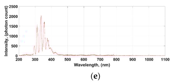 Figure 3 shows the registered spectra of optical radiation in the UV-VIS-NIR range for an electric arc generated at 4 kV AC at different frequencies. The obtained optical spectra of electric arcs for different frequencies of current presented in Figure 3 are mostly similar. The same arc release voltage, 4 kV, was used in the test. The characteristic peaks for each frequency are mainly in the ultraviolet range. However, some differences appear for very different frequency values of the arc generating current. For low frequencies, the spectrum range can be seen in the near-infrared part and partially in the visible light range (Figure 3a). For increasingly higher frequencies (Figure 3b,c), the visible light and NIR components disappear. For frequencies of 100 and 130 kHz (Figure 3d,e), this range is already marginally recorded. It can also be noted that the component in the VIS range for 380–440 nm from a clear peak at low frequencies clearly becomes a Pareto and may not be an important descriptor for this frequency range. Characteristic wavelengths for the presented graphs are collected and presented in Table 1.