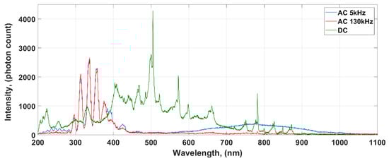 Comparison of spectral characteristics for an electric arc generated in the air at a voltage 4 kV of: 5 kHz AC, 130 kHz AC and DC.