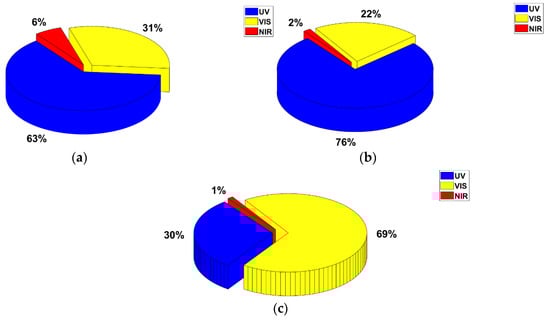 Percentage of optical radiation energy for the analyzed spectral ranges for an electric arc generated in the air at a voltage of 4 kV AC with a frequency 5 kHz (a); 130 kHz (b); and DC voltage (c).