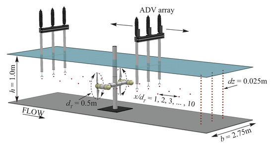 Velocity measurements were collected using three Nortek Vectrino+ acoustic Doppler velocimeters (ADVs) (Figure 3). All ADVs were synchronized with turbine torque and angular position measurements, enabling instantaneous turbine power coefficient calculations, , where is the available power in the flow, defined as , where is the fluid density, is the swept area of the turbine rotor, and is the instantaneous hub height velocity upstream of the turbine rotor. During performance measurements, ADVs were positioned at hub height, , three rotor diameters (3 ) upstream of the RM1 rotor location and sampled at 200 Hz for ten minutes for each rotor angular velocity. The inflow environment was further characterized by vertical velocity profiles collected at 1 , 3 and 5 upstream of RM1. Vertical spacing was 0.05 m and measurements were collected at 200 Hz for three minutes. A horizontal velocity profile spanning the channel width at was collected 1 , 3 and 5 upstream of the RM1 rotors. Wake vertical velocity profiles were collected downstream of the turbine from 1 to 10 with 1 streamwise spacing. One ADV was aligned with the axis of rotation for each rotor (), and the third ADV was positioned at the mid-plane between the rotors centered on the vertical cylindrical support tower for RM1 (located at ). Vertical point spacing was 0.025 m for all wake profiles and measurements were collected for five minutes at each point at 200 Hz. Additionally, a horizontal velocity plane was collected from 1 to 10 with 1 streamwise spacing. Cross-stream ADV point locations varied, yet provided enough spatial resolution to resolve key characteristics of the turbine wake.