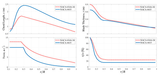 The blade profile used for the scaled RM1 turbine design (NACA-4415) was modified from the original full-scale RM1 design blade profile (NACA-63(4)-24). Blade geometry design, performance characteristics, loading, and cavitation checks were initially performed using the BEM method code HARP-Opt developed at the National Renewable Energy Laboratory (NREL). Model scale blades for RM1 were redesigned to NACA-4415 due to a lower Reynolds number during experiments and availability of low Reynolds number lift () and drag () coefficient data. Table A1 in Appendix A provides details of the blade geometry, while comparisons between full-scale geometry of the original RM1 blade profile and the re-designed NACA-4415 blades are illustrated in Figure 4.