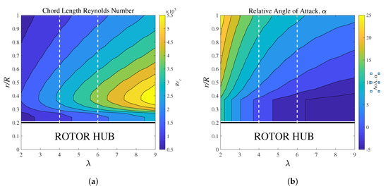 Laboratory-scale models are tested at a much lower Reynolds numbers compared to the full-scale system. This can result in unrealistic lift and drag coefficients that vary compared to the field-scale system counterpart. To determine these differences for the RM1 model tested in this study, XFOIL static models were run to compare aerodynamic coefficients. First, 2D vector flow analysis was modeled to calculate a matrix of model scale chord length Reynolds numbers and local angle-of-attack as a function of tip-speed ratio and local blade element radius (Figure 5). Model-scale mid-span and tip ranged from 1.7 × 10 to 3.0 × 10 in the range of 4–6 where measurements indicated optimal performance (Figure 5a). Similarly, relative angle-of-attack (i.e., the blade angle-of-attack with respect to the resultant velocity vector from the inflow velocity and local blade element velocity) ranged from 2°–9° when the blade pitch was set to 0° (Figure 5b).