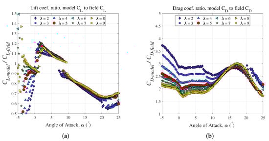 A closer inspection of the predicted lift and drag coefficients at these angles is found in Figure 6. XFOIL simulations were completed for chord length Reynolds number at both model scale ( 8.2 × 10 to 2.7 × 10 for 2 to 9, respectively) and field scale ( 6.8 × 10 to 2.2 × 10 for 2 to 9, respectively. 5 for all cases.). Model-to-Field scale lift coefficient ratios ranged from 1.0–1.2 within the predicted relative angles-of-attack for 4–6 (Figure 6a). Similarly, Model-to-Field scale drag coefficient ratios were approximately 2.0 within the predicted relative angle-of-attacks for these optimal tip-speed ratios (Figure 6b). Given that the torque generating component ratio () is approximately 1.0 between model and field scales, we anticipate the measured performance of the RM1 scaled turbine to be within the Reynolds number independent regime where measured performance characteristics no longer change with increasing Reynolds number.