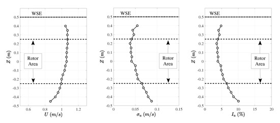 Vertical and horizontal inflow velocity profiles were collected 3 (1.5 m) and 5 (2.5 m) upstream of RM1 (Figure 7 and Figure 8). Average hub height streamwise velocity, 1.04 ms, while turbulence intensity across the rotor swept region was approximately 5%. The shear velocity, , in open channel flow is an important parameter in characterizing the near-wall stresses imposed by the flow on the channel boundaries. This parameter can be estimated using velocity profiles and the logarithmic law of the wall equation,