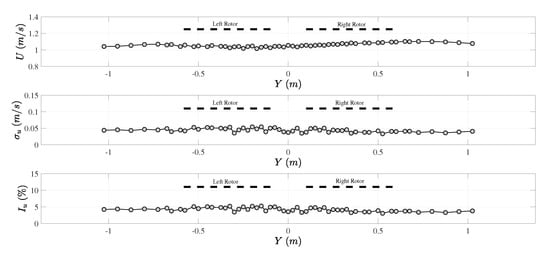 Wake flow recovery in the present study exhibits most of the far-wake ( 5) characteristics observed for single rotor cases despite the added flow obstruction and turbulent mixing caused by the additional rotor, tower and cross-arm support wakes. For single rotor cases, the hub height centerline velocity deficit and turbulence intensity reduce exponentially from their maximum value, averaging 71% flow recovery and 20% turbulence intensity at 5, to an average of 85% flow recovery and 13% turbulence intensity in the far-wake occurring at 10 [31,33,34,35,36,47]. The wake deficit is persistent far downstream with an average of 92% flow recovery and 8% turbulence intensity in the far-wake occurring at 20 [31,34,36]. Values for these parameters in the present dual rotor study are close to these average values with 70% (left rotor) and 68% (right rotor) flow recovery occurring at 5, 89% (left rotor) and 84% (right rotor) at 10, and 94% (left rotor) and 90% (right rotor) at 20. Turbulence intensities were 19% (left rotor) and 16% (right rotor) at 5, 12% for both rotors at and 10, and 10% for both rotors at 20. At 25, the flow recovery for both rotors only slightly improves to approximately 95% with turbulence intensities just below 10%.