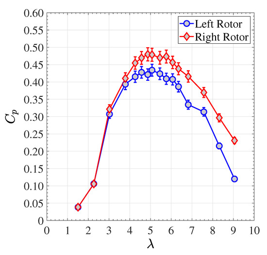 It is important to note that while the performance of a dual-rotor turbine may not be balanced between the two rotors, the counter-rotating operation used in this study does not appear to degrade the individual performance of each rotor. Although performance characteristics of a single rotor operation were not directly measured in the present investigation, the observed power performance characteristics, including the best operating point, match those predicted using numerical models and other physical scaled model experiments of single rotors [50]. Asymmetric performance and loading, however, may intensify structural loads for devices that share a common support tower.