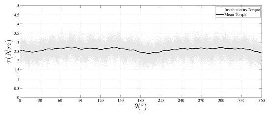 Instantaneous torque (light gray dots) measurements, vs. instantaneous rotor blade angular position, . Solid black line illustrates mean torque value, vs. rotor blade angular position, . Measurements collected from right rotor while turbine was operating at = 3.4 rps ( 5.1). RM1 blades are offset 180° on each rotor but were counter-rotating in symmetry.