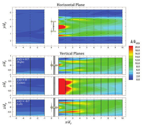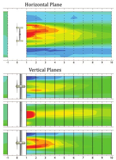 Turbine wake velocity profiles were collected downstream of RM1 from 1 to 10 at 1 intervals. These data were collected along three vertically oriented () planes aligned with each rotor center and the mid-plane ( 0) between the two rotors, as well as a horizontal () plane aligned with the rotor hub height, . Contour plots of the streamwise velocity deficit, , are illustrated in Figure 11. Additionally, normalized turbulent kinetic energy, are illustrated in Figure 12. The largest velocity deficit occurs in the near wake region at the center between the two rotors, immediately downstream of the center cylindrical vertical and horizontal support arms. The relatively high blockage ( 14.3%) forces flow acceleration to the outside of each rotor, as well as above and below each rotor, visible in Figure 11. The wake of each RM1 rotor quickly merges with the disturbance created by the center tower and forms a horizontally expansive wake that propagates far downstream and remains approximately the width of the full dual rotor RM1 assembly while diffusing and mixing with the surrounding flow. Elevated levels of turbulent kinetic energy are present in the downstream environment, particularly in the region aligned with the center support tower extending to approximately 2. Additionally, the tip vortices originating from the blades introduce elevated regions of turbulent kinetic energy aligned with the top-tip and bottom-tip elevation of each rotor, evident in Figure 12.