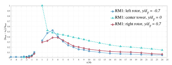 It is common to report the velocity deficit at turbine hub height downstream of a turbine as a way to estimate the velocity recovery in the wake of a device. The RM1 rotors begin affecting inflow velocities up to approximately 2.5 to 3 upstream, at which point the flow decelerates by approximately 10% by the time it is one blade length upstream of the rotor energy extraction plane (Figure 13). The largest velocity deficit occurs in the wake of the center support tower ( 100%), where strong instabilities exist occurring in the form of von Kármán type vortices shed from the cylinder. The near-wake (≈ 1) velocity deficit in the wake of each rotor is approximately 30% and increases up to about 3 to 4 , at which point it begins to gradually recover. The relatively large blockage by the two rotors and center cylinder support tower generates a large wake that propagates far downstream. Hub height velocity measurements were collected up to 24 , at which point the velocity deficit recovered to about 5% of the undisturbed approach flow in the wake of each rotor, while the center of the wake was still nearly 15% deficient. Similarly, neither streamwise turbulent fluctuations, (Figure 14), nor the streamwise turbulence intensity, (Figure 15), recovered to the undisturbed upstream equivalent values as far downstream as 24 .
