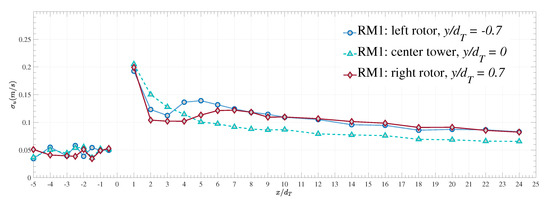 Hub height streamwise root-mean squared (). RM1 rotors located at 0. Measurements collected at 5.1 ( 3.4 rps).