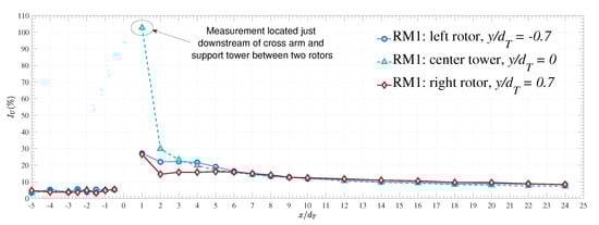 Hub height streamwise turbulence intensity, . RM1 rotors located at 0. Measurements collected at 5.1 ( 3.4 rps).