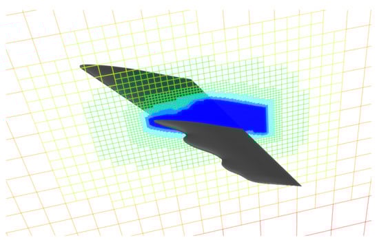 The initial lattice structure can be modified during the simulations by the XFlow solver based on several criteria. First, if the computational domain changes due to presence of moving geometries, the lattice can dynamically be refined to follow the new position of the geometry every time step. Other adaptive refinement criteria to adapt the flow physics are also available. A refinement algorithm based on the level of vorticity is effective to dynamically refine the wake region (Figure 1), characterized by high vorticity. Wake refinement is activated when the local dimensionless vorticity is larger than a threshold value, . Additionally, the wake distance is controlled by a defined distance from the object up to which the wake refinement will take place. The Manhattan distance [] (the distance between two points in a grid based on a strictly horizontal and/or vertical path) is used to calculate the distance from the object to any lattice node in order to impose such condition.