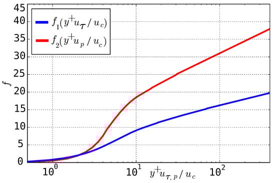 where y is the normal distance from the wall, is the velocity skin friction, is the wall shear stress, is the wall pressure gradient with x the local tangential to the wall direction, is a velocity of the wall streamwise pressure gradient and U is the mean velocity at a distance from the wall. The interpolating functions and are shown in Figure 2.