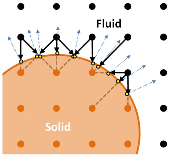 The lattice Boltzmann method solves Boltzmann’s transport equation using probability distribution functions, f, to describe the mesoscopic scale of fluid flow []. The method uses a collision-streaming scheme to solve the discrete Boltzmann equation: