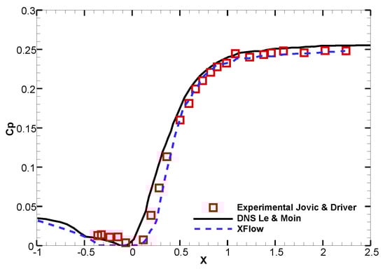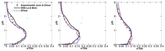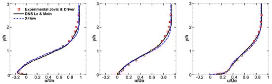 In addition to the reattachment length, included in Table 1, in this section we included the distribution of mean and standard deviations for the velocity and pressure at different longitudinal sections, = 4 (recirculation region), 6 (reattachment location) and 10. The results extracted from XFlow are compared with Le and Moin [] and Jovic and Driver [] numerical and experimental results, respectively.