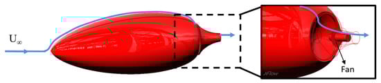 The self-propulsive fuselage concept was introduced by F. R. Goldschmied in the 50’s [,] showing promise in reducing drag and increasing the aerodynamic efficiency of bullet shape fuselages (see Figure 9). Namely, Goldschmied introduced the idea of including an almost passive flow control strategy to force the flow to remain attached, hence reducing drag. To control separation a fan is installed within the body tail and induces a pressure deficit. It is capable of forcing the flow to remain attached even in presence of strong adverse pressure gradients induced by the body geometry. The challenge for XFlow is to predict correctly the detached flow with different pressure gradients produced by the fan.