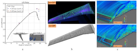 High-Lift aircraft configuration: (a) Lift coefficients on conf. 2 and conf. 5 for Re (b) Flow pattern comparison between XFlow (bottom) and wind-tunnel oil flow images (top) for the stall region with conf. 5. (c) Volumetric rendering of vorticity comparison between Conf. 2 (top) and Conf. 5 (bottom) at 24 deg [].
